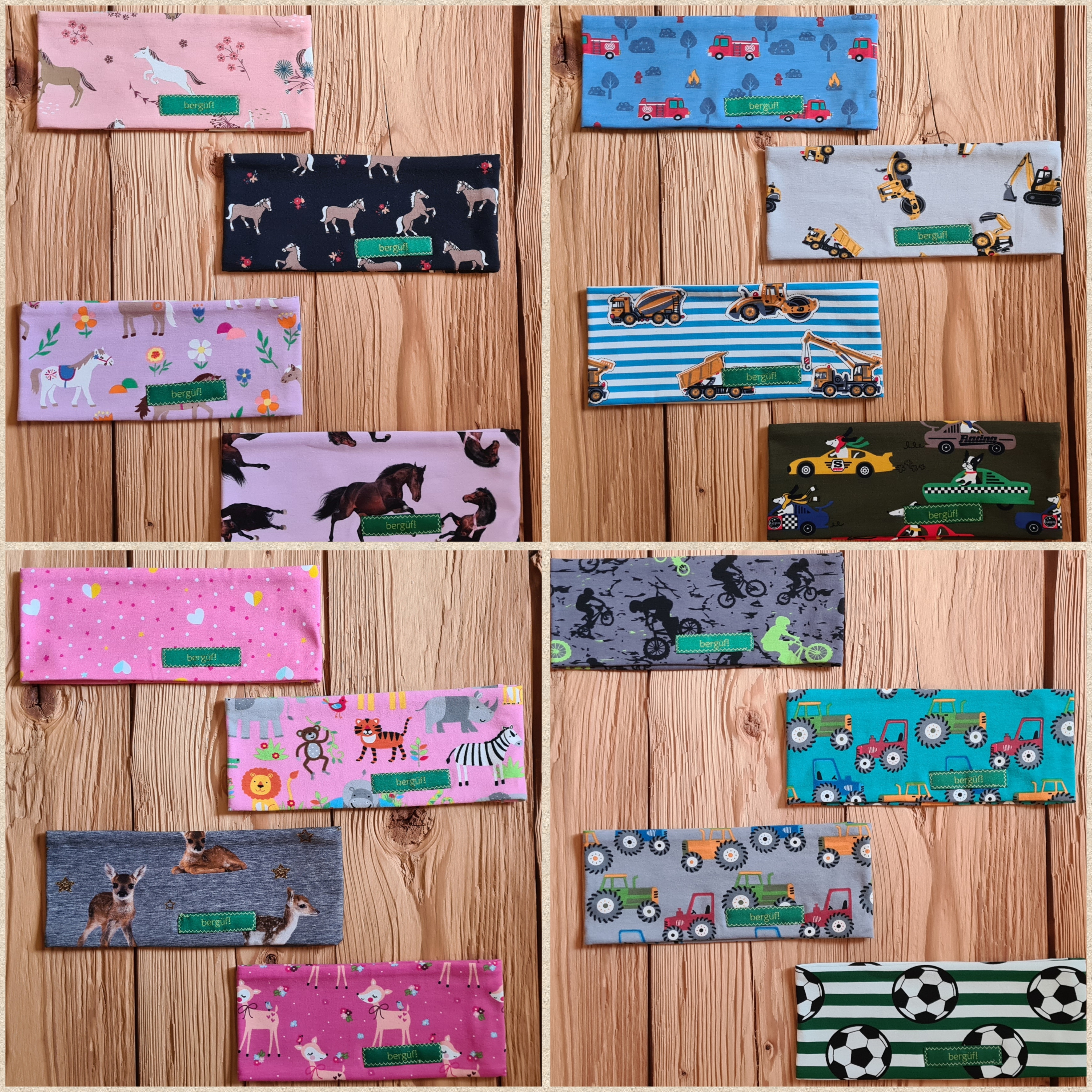 Die Stirnbänder sind aus Baumwolljersey und können auf beiden Seiten getragen werden.